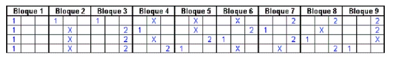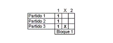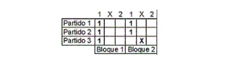Donde cada bloque corresponde a una apuesta simple. Si hubiéramos puesto un triple, es decir, un 1, una X y un 2 en el partido 3, habríamos jugado 3 apuestas y tendríamos 3 bloques. Éste sería el resultado: