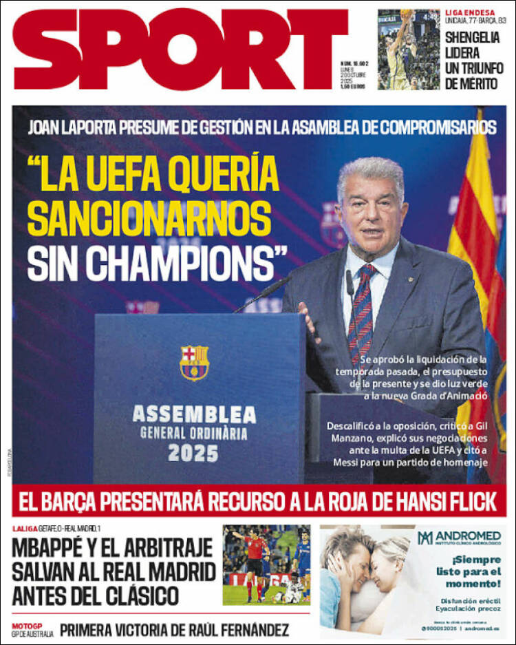 Portada diario Sport: La UEFA quería sancionarnos sin Champions.